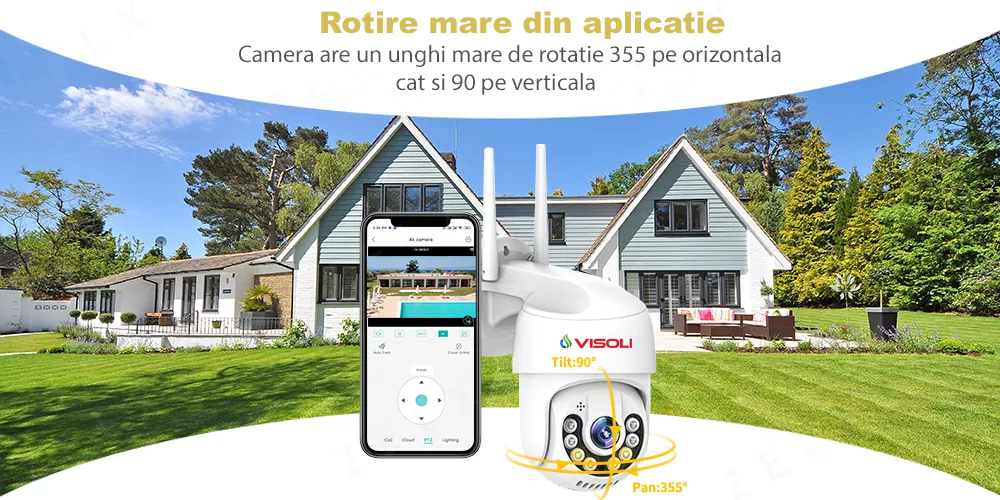 - Rotire automată controlată din aplicație, permițând ajustarea direcției camerei din confortul telefonului mobil.